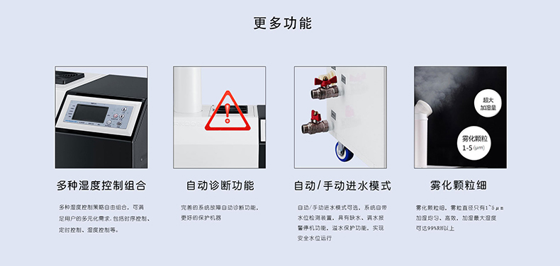 ※ 濕度數碼全自動控制,控制系統配備進口濕度傳感器,控制精度高、反應迅速。設定后連續工作, 無    需人員職守